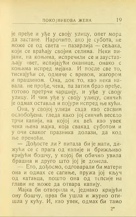је пређе и уђе у своју улицу, опет мора да застане. Нарочито, ако је субота, не може се од света — пазарлија — сељака, који се враћају својим селима. Неки пијани, на коњима, испречили се и заустављају свет, испијајући оканице, онако с коњима испред мејана. И после све то, тискајући се, одмиче с вревом, жагором и прашином. Она, док то, као нека навала, не прође, чека, па затим брзо пређе, готово претрчи чаршију, и уђе у своју улицу. И чим уђе у своју улицу, синчић је одмах оставља и појури испред ње кући.