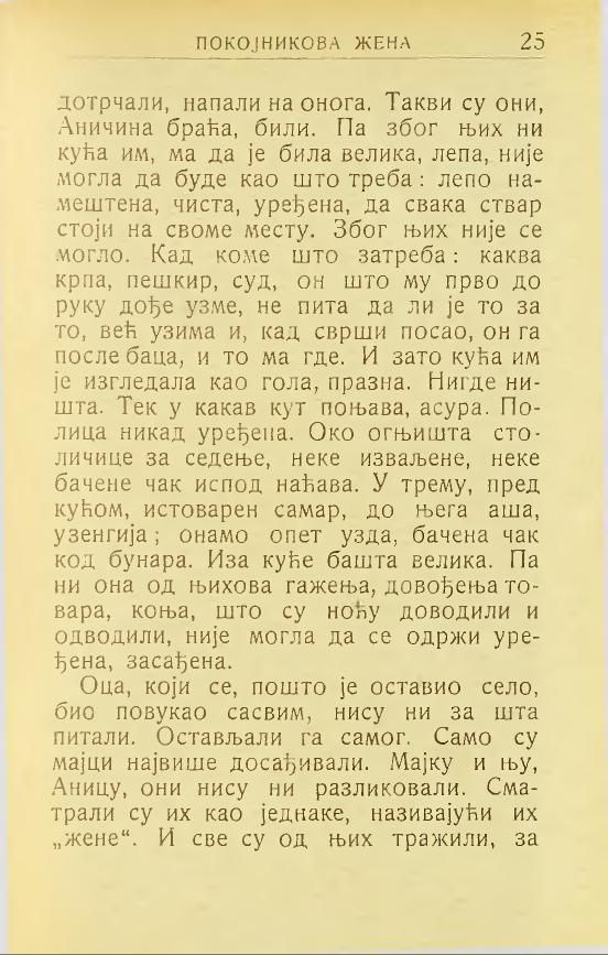 дотрчали, напали на онога. Такви су они, Аничина браћа, били. Па због њих ни кућа им, ма да је била велика, лепа, није могла да буде као што треба: лепо намештена, чиста, уређена, да свака ствар стоји на своме месту. Због њих није се могло. Кад коме што затреба: каква крпа, пешкир, суд, он што му прво до руку дође узме, не пита да ли је то за то, већ узима и, кад сврши посао, он га после баца, и то ма где. И зато кућа им је изгледала као гола, празна. Нигде ништа. Тек у какав кут поњава, асура. Полица никад уређена. Око огњишта столичице за седење, неке изваљене, неке бачене чак испод наћава. У трему, пред кућом, истоварен самар, до њега аша, узенгија; онамо опет узда, бачена чак код бунара. Иза куће башта велика. Па ни она од њихова гажења, довођења товара, коња, што су ноћу доводили и одводили, није могла да се одржи уређена, засађена.