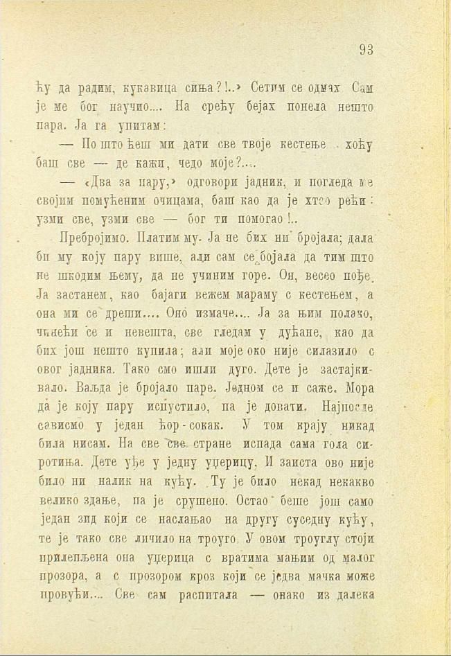 Пребројимо. Платим му. Ја не бих ни бројала; дала би му коју пару више, али сам се бојала да тим што не шкодим њему, да не учиним горе. Он, весео пође. Ја застанем, као бајаги вежем мараму с кестењем, а она ни се дреши.... Оно измаче.... Ја за њим полако, чинећи се и невешта, све гледам у дућане, као да бих још нешто купила; али моје око није силазило с овог јадника. Тако смо ишли дуго. Дете је застајкивало. Ваљда је бројало паре. Једном се и саже. Мора да је коју пару испустило, па је довати. Најпосле сависмо у један ћор-сокак. У том крају никад била нисам. На све стране испада сама гола сиротиња. Дете уђе у једну уџерицу. И заиста ово није било ни налик на кућу. Ту је било некад некакво велико здање, па је срушено. Остао беше још само један зид који се наслањао на другу суседну кућу, те је тако све личило на троуго. У овом троуглу стоји прилепљена она уџерица с вратима мањим од малог прозора, а с прозором кроз који се једва мачка може провући.... Све сам распитала — онако из далека