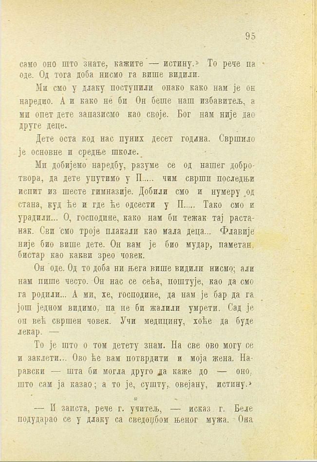 Ми добијемо наредбу, разуме се од нашег добротвора, да дете упутимо у П..... чим сврши последњи испит из шесте гимназије. Добили смо и нумеру од стана, куд ће и где ће одсести у П..... Тако смо и урадили... О, господине, како нам би тежак тај растанак. Сви смо троје плакали као мала деца... Флавије није био више дете. Он вам је био мудар, паметан, бистар као какви зрео човек.