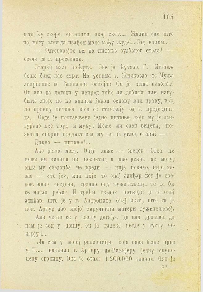 Старац мало поћута. Све је ћутало. Г. Мишељ беше блед као смрт. На устима г. Жилкреда де-Муља лепршаше се ђаволски осмејак. Он је вешт адвокат. Он зна да погоди у напред хоће ли добити или изгубити спор, не по каквом јаком основу или праву, већ по правцу питања која се стављају од г. председника... Овде је постављено једно питање, које му је осигурало цео труд и муку: Може ли слеп видети, познати, спорни предмет кад му се на углед стави? — —