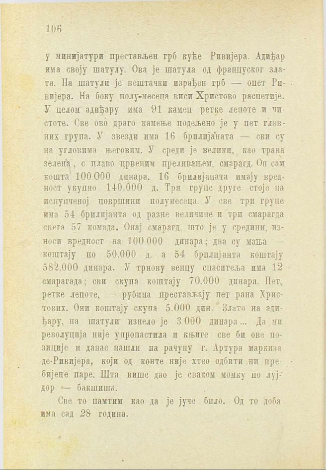 у минијатури престављен грб куће Ривијера. Адиђар има своју шатулу. Ова је шатула од француског злата. На шатули је вештачки израђен грб — опет Ривијера. На баку полу-месеца виси Христово распетије. У целом адиђару има 91 камен ретке лепоте и чистоте. Све ово драго камење подељено је у пет главних група. У звезди има 16 брилијаната — сви су на угловима његовим. У среди је велики, као трава зелен, с плаво црвеним преливањем, смарагд. Он сам кошта 100.000 динара. 16 брилијаната имају вредност укупно 140.000 д. Три групе друге стоје на испупченој површини полумесеца. У све три групе има 54 брилијанта од разне величине и три смарагда свега 57 комада. Онај смарагд, што је у средини, износи вредност на 100 000 динара; два су мања — коштају по 50.000 д. а 54 брилијанта коштају 582.000 динара. У трнову венцу спаситеља има 12 емарагада; сви скупа коштају 70.000 динара. Пет, ретке лепоте, — рубина престављају пет рана Христових. Они коштају скупа 5.000 дин, Злато на адиђару, на шатули изнело је 3.000 динара... Да ми револуција није упропастила и књиге све би ове позиције и данас нашли на рачуну г. Артура маркиза де-Ривијера, који од конте није хтео одбити, ни пребијене паре. Шта више дао је сваком момку по лујдор бакшиша.
