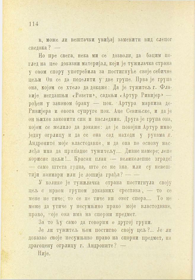 Но пре свега, нека ми се дозволи, да бацим поглед на цео доказни материјал, који је тужилачка страна у овом спору употребила за постигнуће своје себичне цељи Он се да поделити у две групе. Прва је група она, којом се хтело да докаже: Да је тужитељ г. Флавије негдашњи «Розети», садањи «Артур Ривијер» — рођен у законом браку — пок. Артура маркиза де-Ривијера и овога супруге пок. Ане Севињске, и даје он њихов законити син и наследник. Друга је група она, којом се желило да докаже: да је покојни Артур имао једну огрлицу и да се она сад находи у рукама г. Андроните моје властодавке, и да она по основу наслеђа има да припадне тужитељу.... Дивне намере; лепе корисне цељи!... Красан план — великолепне зграде! — само штета грдна, што се не зна, или су невештији наимари или је лошија грађа?