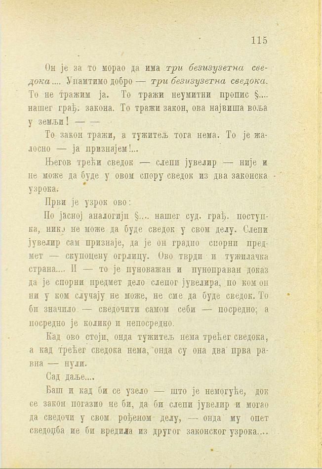 Он је за то морао да има три безизузетна сведока.... Упамтимо добро — три безизузетна сведока. То не тражим ја. То тражи неумитни пропис §.... нашег грађ. закона. То тражи закон, ова највиша воља у земљи! — —