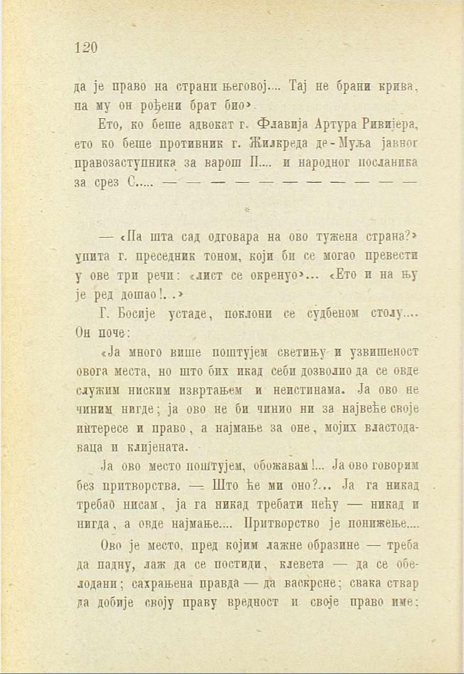Ето, ко беше адвокат г. Флавија Артура Ривијера, ето ко беше противник г. Жилкреда де-Муља јавног правозаступника за варош П.... и народног посланика за срез С.....