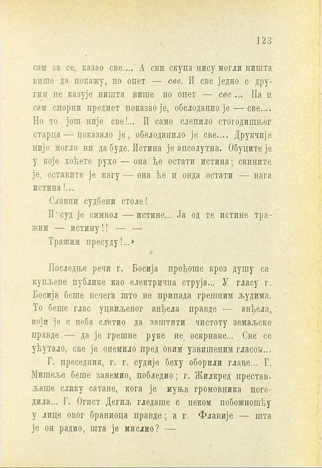 Последње речи г. Босија прођоше кроз душу сакупљене публике као електрична струја... У гласу г. Босија беше нечега што не припада грешним људима. То беше глас уцвиљеног анђела правде — анђела, који је с неба слетио да заштити чистоту земаљске правде — да је грешне руке не, оскрнаве... Све се ућутало, све је онемило пред овим узвишеним гласом...