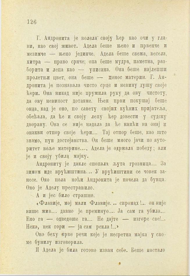 Г. Андронита је волела своју ћер као очи у глави, као свој живот. Адела беше њено и првенче и мезимче — њено јединче. Адела беше свежа, весела, хитра — право срнче; она беше мудра, паметна, разборита и лепа као — уписана. Она беше најлепши пролетњи цвет, она беше — понос материн. Г. Андронита је познавала чисто срце и невину душу своје ћери. Она никад није пружила руку да ову чистоту, да ову невиност дотакне. Њен први покушај беше онда, кад је оно, по савету својих кућних пријатеља, обећала, да ће и своју лепу ћер довести у судску дворану. Она се није надала да ће наићи на онај и онакви отпор своје ћери.... Тај отпор беше, као што знамо, пун достојанства. Он беше много јачи но ауторитет воље материне.... Адела је одржала победу; али је и своју убила мајку.