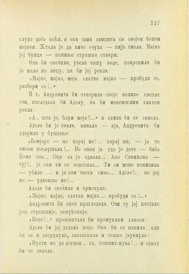 «Бомјере — не карај не!.. карај ме, — ја те нисам послушала!... Не знам ја где је дете — баба Џома зна... Она га је одвела... Ано Севињска — чуј!... ја сам ти се осветила.... Ти си мене понизила — убила.... и ја сам твога сина.... Адело!... не дај ме — удавише ме!...