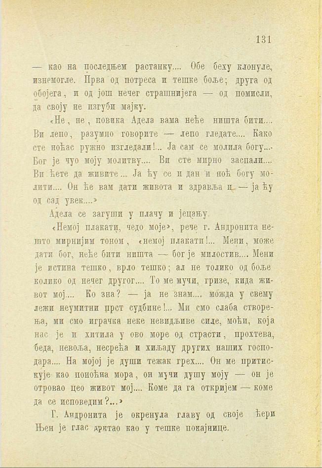 «Немој плакати, чедо моје», рече г. Андронита нешто мирнијим тоном, «немој плакати!... Мени, може дати бог, неће бити ништа — бог је милостив.... Мени је истина тешко, врло тешко; ал не толико од боље колико од нечег другог.... То ме мучи, гризе, кида живот мој.... Ко зна? — ја не знам.... можда у свему лежи неумитни прст судбине!... Ми смо слаба створења, ми смо играчка неке невидљиве силе, моћи, која нас је и хитила у ово море од страсти, прохтева, беда, невоља, несрећа и хиљаду других наших господара.... На мојој је души тежак грех.... Он ме притискује као поноћна мора, он мучи душу моју — он је отровао цео живот мој.... Коме да га откријем — коме да се исповедим?...»