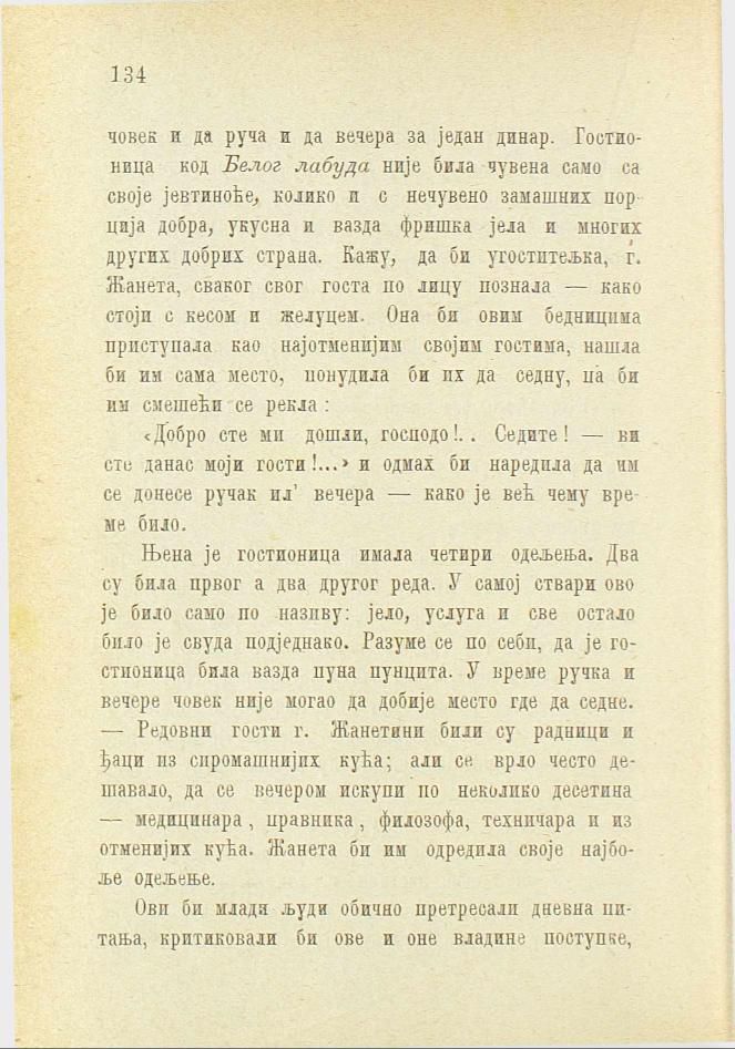Њена је гостионица имала четири одељења. Два су била првог а два другог реда. У самој ствари ово је било само по називу: јело, услуга и све остало било је свуда подједнако. Разуме се по себи, да је гостионица била вазда пуна пунцита. У време ручка и вечере човек није могао да добије место где да седне. — Редовни гости г. Жанетини били су радници и ђаци из сиромашнијих кућа; али се врло често дешавало, да се вечером искупи по неколико десетина — медицинара, правника, филозофа, техничара и из отменијих кућа. Жанета би им одредила своје најбоље одељење.