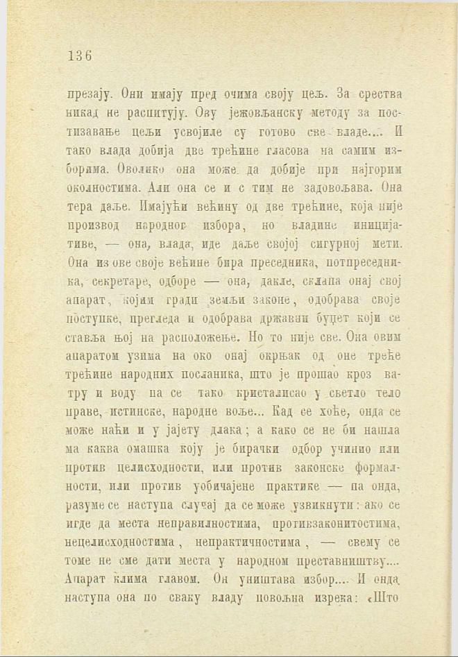 презају. Они имају пред очима своју цељ. За срества никад не распитују. Ову јежовљанску методу за постизавање цељи усвојиле су готово све владе.... И тако влада добија две трећине гласова на самим изборима. Оволико она може да добије при најгорим околностима. Али она се и с тим не задовољава. Она тера даље. Имајући већину од две трећине, која није производ народног избора, но владине иницијативе, — она, влада, иде даље својој сигурној мети. Она из ове овоје већине бира преседника, потпреседника, секретаре, одборе — она, дакле, скапа онај свој апарат, којим гради земљи законе, одобрава своје поступке, прегледа и одобрава државни буџет који се ставља њој на расположење. Но то није све. Она овим апаратом узима на око онај окрњак од оне треће трећине народних посланика, што је прошао кроз ватру и воду па се тако кристалисао у светло тело праве, истинске, народне воље... Кад се хоће, онда се може наћи и у јајету длака; а како се не би нашла ма каква омашка коју је бирачки одбор учинио или против целисходности, или против законске формалности, или против уобичајене практике — па онда, разуме се наступа случај да се може узвикнути: ако се игде да места неправилностима, противзаконитостима, нецелисходностима, непрактичностима, — свему се томе не сме дати места у народном преставништву.... Апарат клима главом. Он уништава избор.... И онда наступа она по сваку владу повољна изрека: «Што