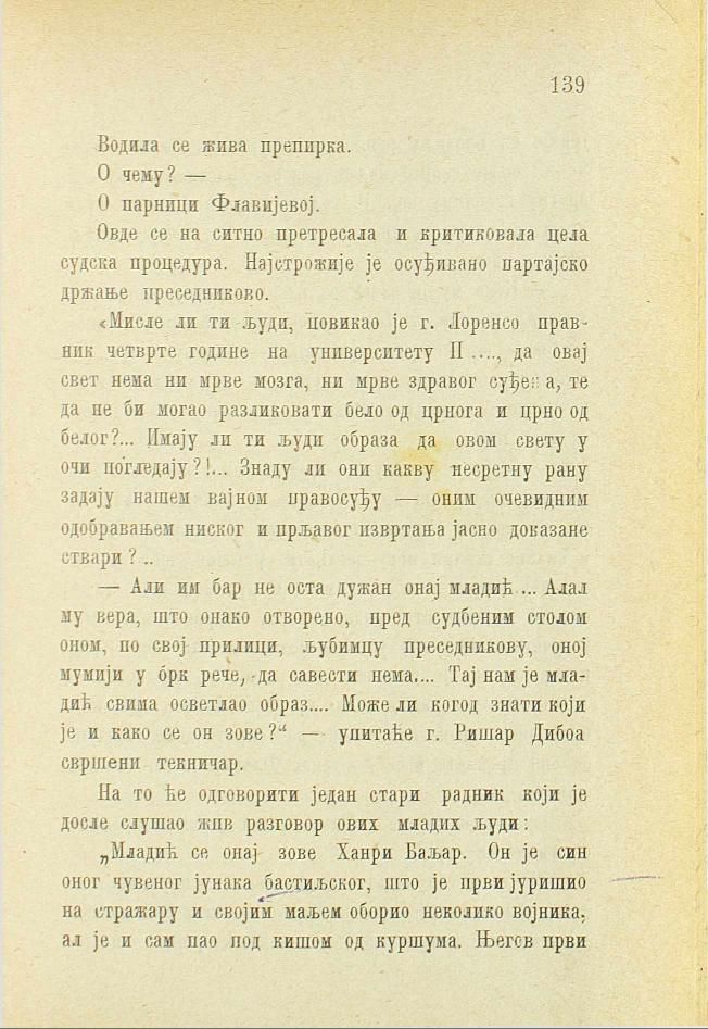 — Али им бар не оста дужан онај младић... Алал му вера, што онако отворено, пред судбеним столом оном, по свој прилици, љубимцу преседникову, оној мумији у брк рече, да савести нем.,... Тај нам је младић свима осветлао образ.... Може ли когод знати који је и како се он зове?“ — упитаће г. Ришар Дибоа свршени текничар.