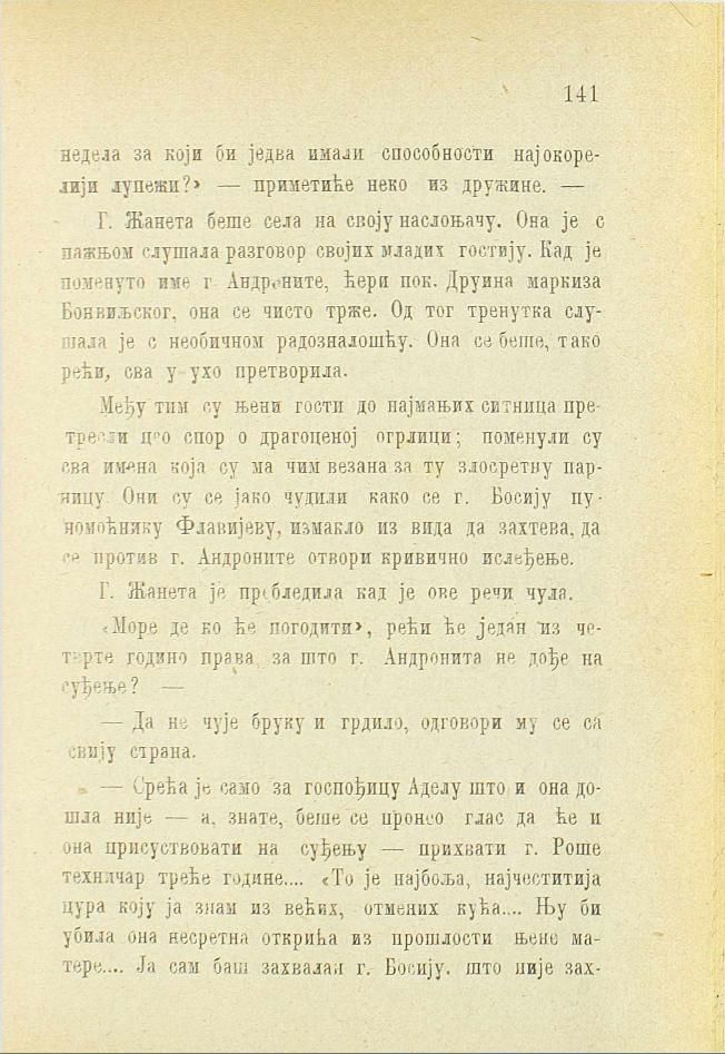 Г. Жанета беше села на своју наслоњачу. Она је с пажњом слушала разговор својих младих гостију. Кад је поменуто име г Андроните, ћери пок. Друина маркиза Бонвиљског, она се чисто трже. Од тог тренутка слушала је с необичном радозналошћу. Она се беше, тако рећи, сва у ухо претворила.