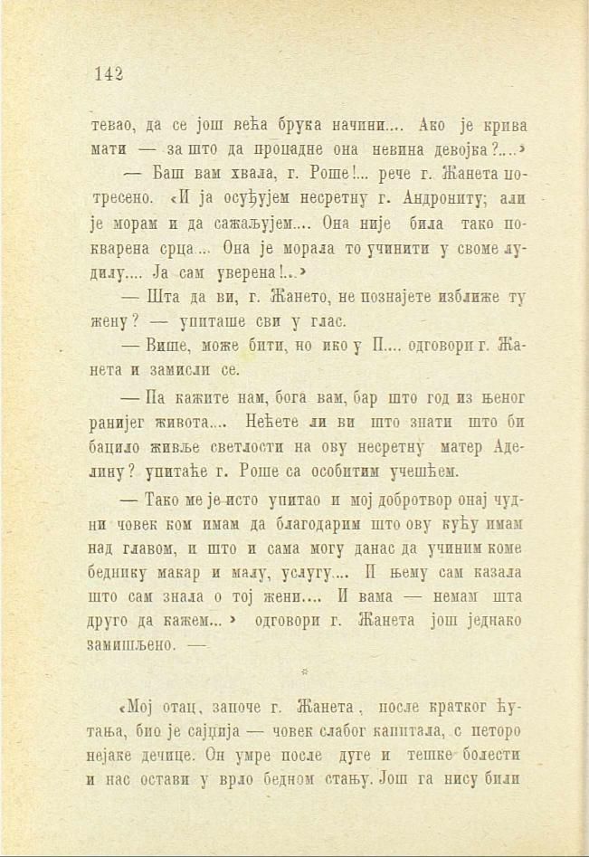 «Мој отац, започе г. Жанета, после кратког ћутања, био је сајџија — човек слабог капитала, с петоро нејаке дечице. Он умре после дуге и тешке болести и нас остави у врло бедном стању. Још га нису били