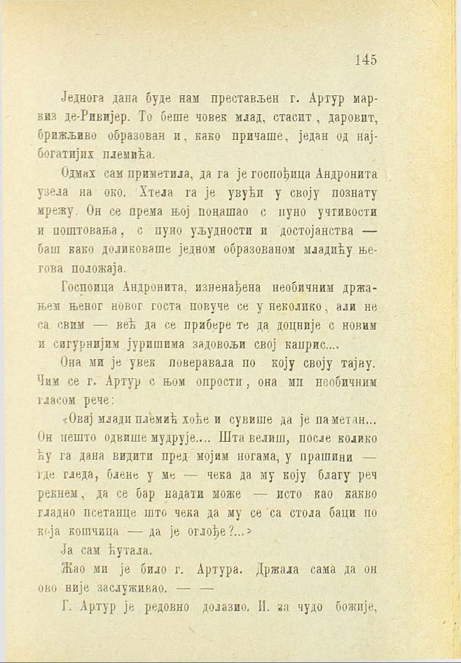 Једнога дана буде нам престављен г. Артур маркиз де-Ривијер. То беше човек млад, стасит, даровит, брижљиво образован и, кано причаше, један од најбогатијих племића.