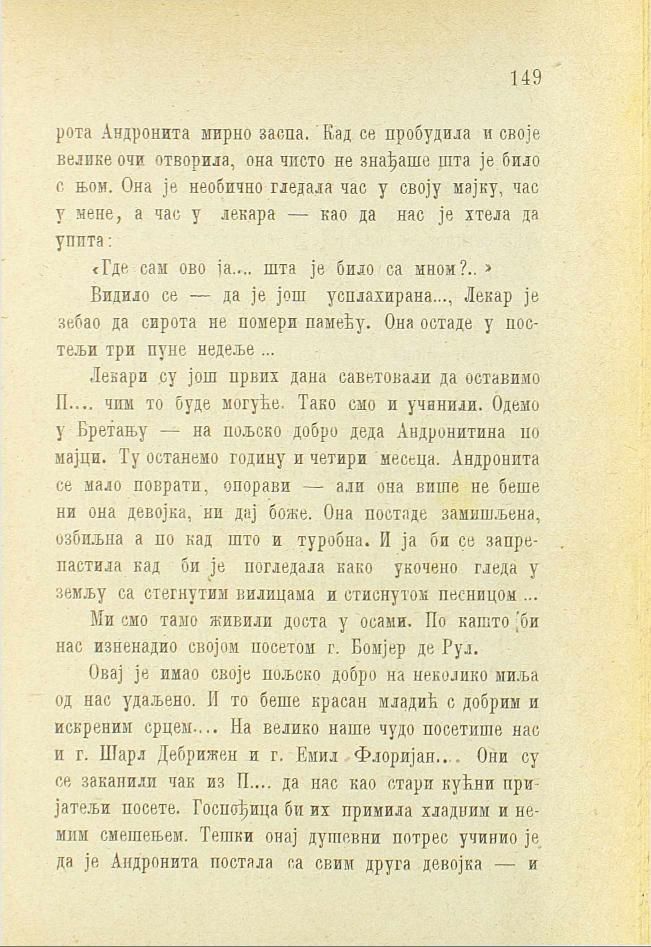 Овај је имао своје пољско добро на неколико миља од нас удаљено. И то беше красан младић с добрим и искреним срцем.... На велико наше чудо посетише нас и г. Шарл Дебрижен и г. Емил Флоријан.... Они су се заканили чак из П.... да нас као стари кућни пријатељи посете. Госпођица би их примила хладним и немим смешењем. Тешки онај душевни потрес учинио је да је Андронита постала са свим друга девојка — и