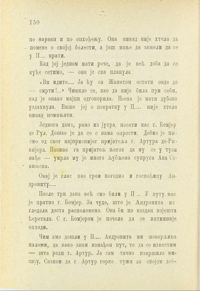 Чим смо дошли у П.... Андронита ми поверљиво наложи, да како знам изнађем пут, те да се известим — шта ради г. Артур. Ја сам тачно извршила мисију. Сазнам да г. Артур горко гужа за својом добром