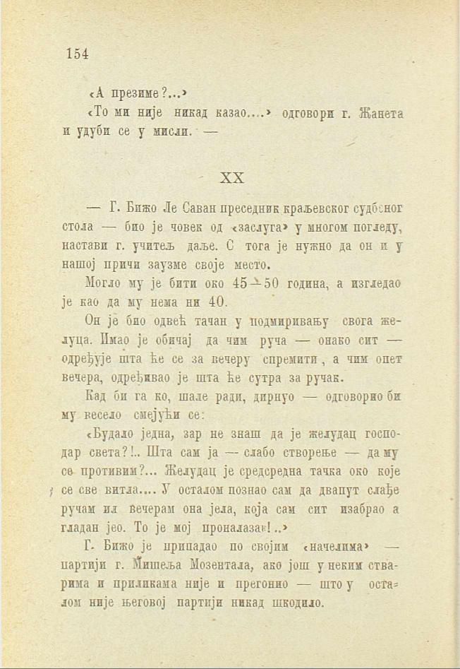 — Г. Бижо Ле Саван преседник краљевског судбеног стола — био је човек од «заслуга» у многом погледу, настави г. учитељ даље. С тога је нужно да он и у нашој причи заузме своје место.
