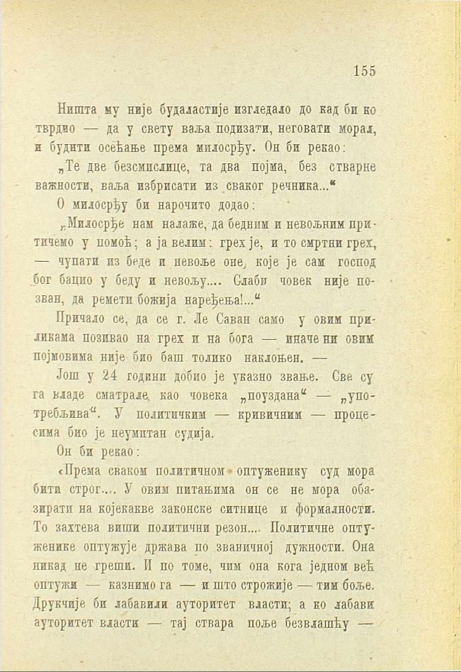 „Милосрђе нам налаже, да бедним и невољним притичемо у помоћ; а ја велим: грех је, и то смртни грех, — чупати из беде и невоље оне, које је сам господ бог бацио у беду и невољу.... Слаби човек није позван, да ремети божија наређења!...“