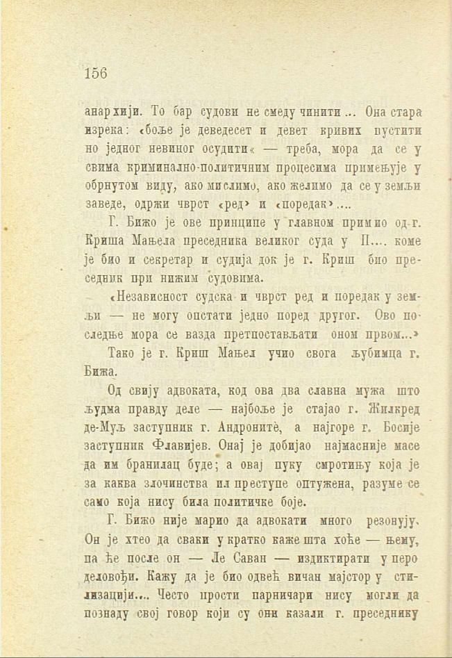 анархији. То бар судови не смеду чинити ... Она стара изрека: «боље је деведесет и девет кривих пустити но једног невиног осудити« — треба, мора да се у свима криминално-политичним процесима примењује у обрнутом виду, ако мислимо, ако желимо да се у земљи заведе, одржи чврст «ред» и «поредак»....