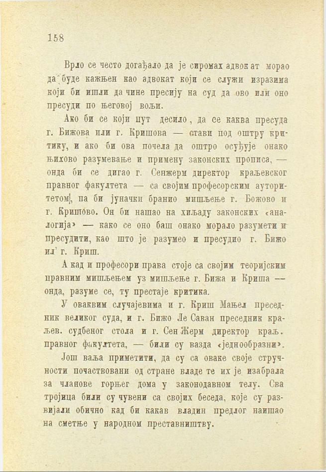 Ако би се који пут десило, да се каква пресуда г. Бижова или г. Кришова — стави под оштру критику, и ако би ова почела да оштро осуђује онако њихово разумевање и примену законских прописа, — онда би се дигао г. Сенжерм директор краљевског правног факултета — са својим професорским ауторитетом, па би јуначки бранио мишљење г. Божово и г. Кришово. Он би нашао на хиљаду законских «аналогија» — како се оно баш онако морало разумети и пресудити, као што је разумео и пресудио г. Бижо ил' г. Криш.