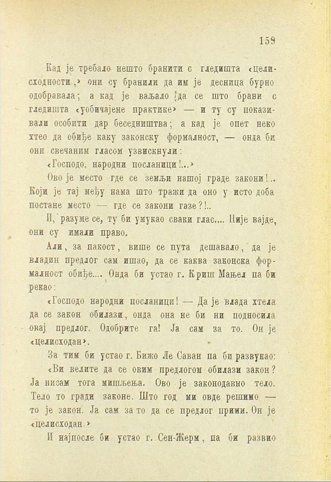 Али, за пакост, више се пута дешавало, да је владин предлог сам ишао, да се каква законска формалност обиђе.... Онда би устао г. Криш Мањел па би рекао: