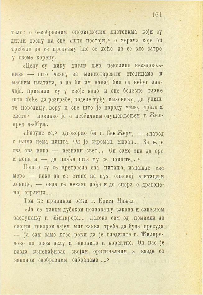 «Разуме се,» одговорио би г. Сен Жерм, — «народ с њима нема ништа. Он је скроман, миран.... За њ је сва ова вика — незнани свет.... Он само зна да оре и копа и — да плаћа шта му се поиште....»