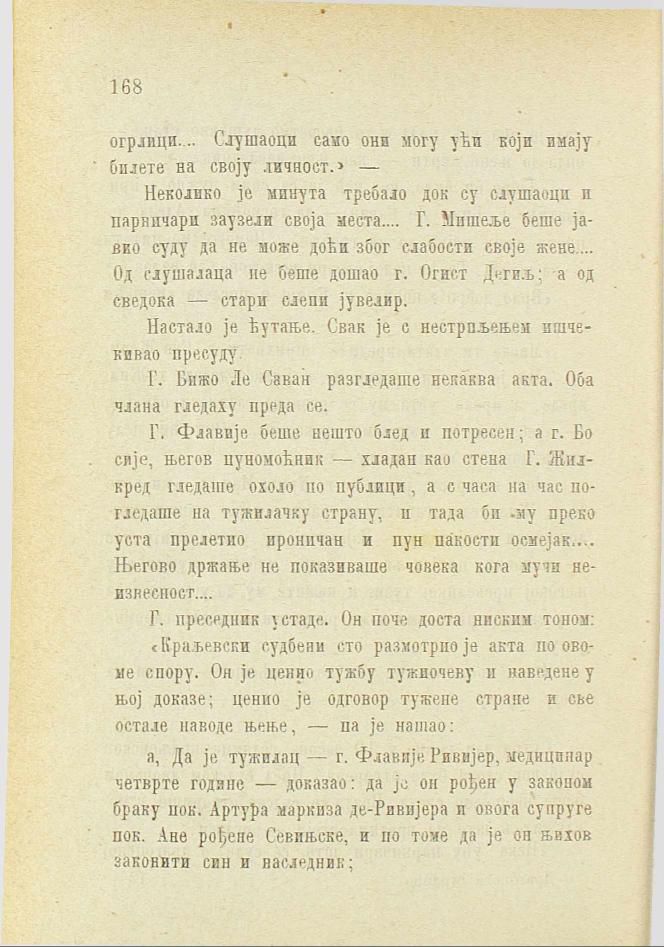 Неколико је минута требало док су слушаоци и парничари заузели своја места.... Г. Мишеље беше јавио суду да не може доћи због слабости своје жене.... Од слушалаца не беше дошао г. Огист Дегиљ; а од сведока — стари слепи јувелир.