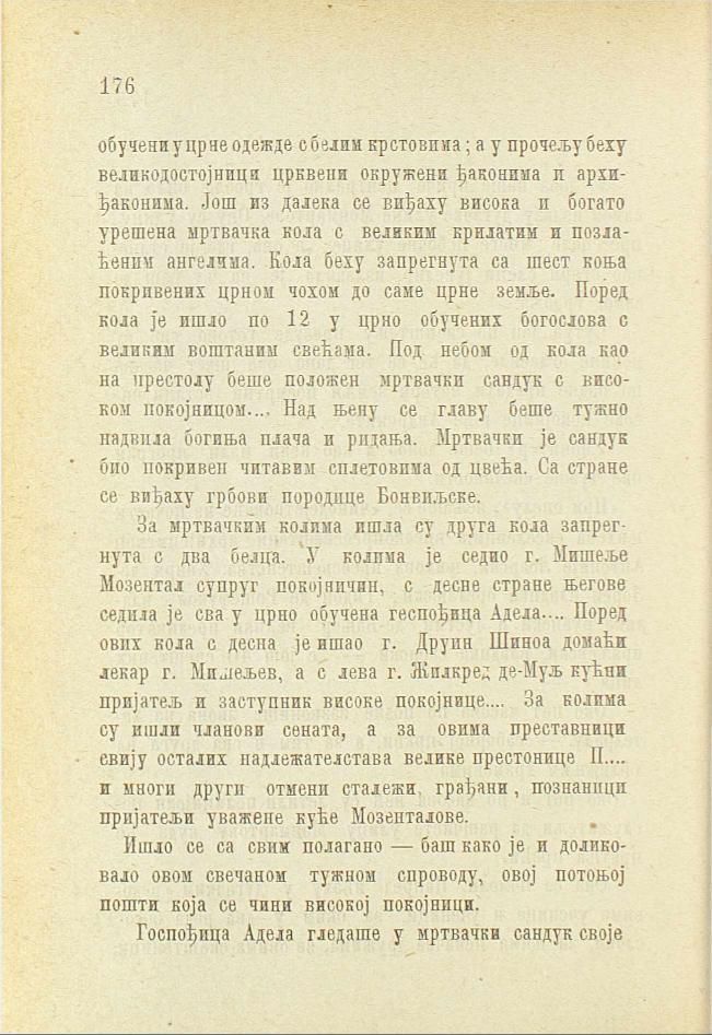 За мртвачким колима ишла су друга кола запрегнута с два белца. У колима је седио г. Мишеље Мозентал супруг покојничин, с десне стране његове седила је сва у црно обучена геспођица Адела.... Поред ових кола с десна је ишао г. Друин Шиноа домаћи лекар г. Мишељев, а с лева г. Жилкред де-Муљ кућни пријатељ и заступник високе покојнице.... За колима су ишли чланови сената, а за овима преставници свију осталих надлежателстава велике престонице П.... и многи други отмени сталежи, грађани, познаници пријатељи уважене куће Мозенталове.