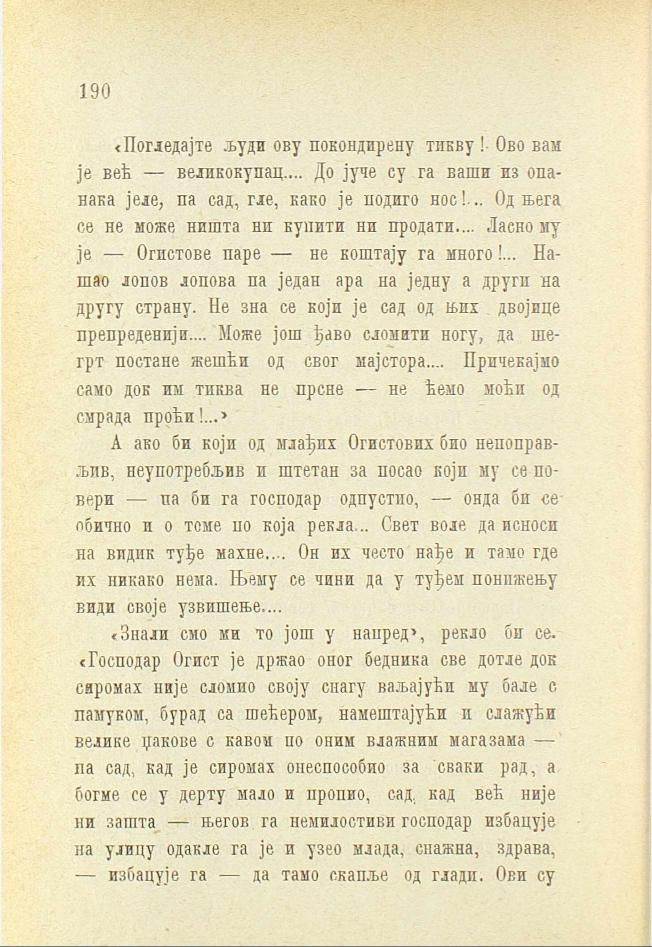 «3нали смо ми то још у напред», рекло би се. «Господар Огист је држао оног бедника све дотле док сиромах није сломио своју снагу ваљајући му бале с памуком, бурад са шећером, намештајући и слажући велике џакове с кавом по оним влажним магазама — па сад, кад је сиромах онеспособио за сваки рад, а богме се у дерту мало и пропио, сад, кад већ није ни зашта — његов га немилостиви господар избацује на улицу одакле га је и узео млада, снажна, здрава, — избацује га — да тамо скапље од глади. Ови су