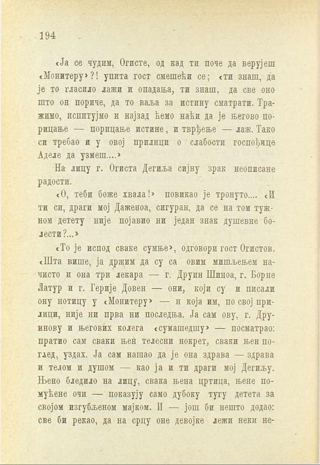 «То је испод сваке сумње», одговори гост Огистов. «Шта више, ја држим да су са овим мишљењем начисто и она три лекара — г. Друин Шиноа, г. Борне Латур и г. Герије Довен — они, који су и писали ону нотицу у Монитеру — и која им, по свој прилици, није ни прва ни последња. Ја сам ову, г. Друинову и његових колега «сумашедшу» — посматрао: пратио сам сваки њен телесни покрет, сваки њен поглед, уздах. Ја сам нашао да је она здрава — здрава и телом и душом — као ја и ти драги мој Дегиљу. Њено бледило на лицу, свака њена цртица, њене помућене очи — показују само дубоку тугу детета за својом изгубљеном мајком. И — још би нешто додао: све би рекао, да на срцу оне девојке лежи неки неодољив