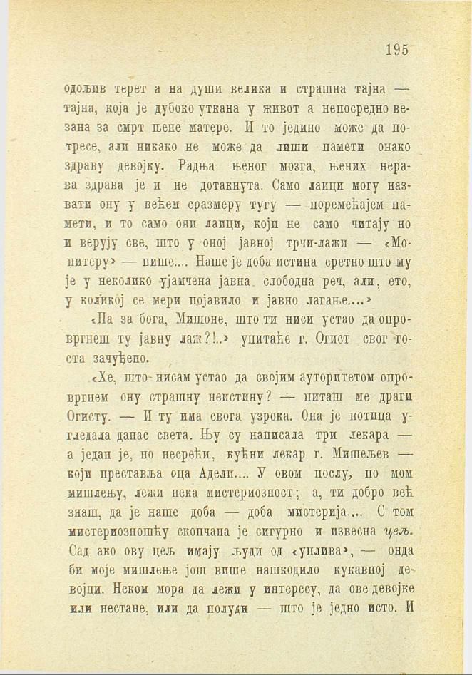 «Хе, што нисам устао да својим ауторитетом опровргнем ону страшну неистину? — питаш ме драги Огисту. — И ту има свога узрока. Она је нотица угледала данас света. Њу су написала три лекара — а један је, но несрећи, кућни лекар г. Мишељев — који преставља оца Адели.... У овом послу, по мом мишлењу, лежи нека мистериозност; а, ти добро већ знаш, да је наше доба — доба мистерија.... С том мистериозношћу скопчана је сигурно и извесна цељ. Сад ако ову цељ имају људи од «уплива», — онда би моје мишлење још више нашкодило кукавној девојци. Неком мора да лежи у интересу, да ове девојке или нестане, или да полуди — што је једно исто. И