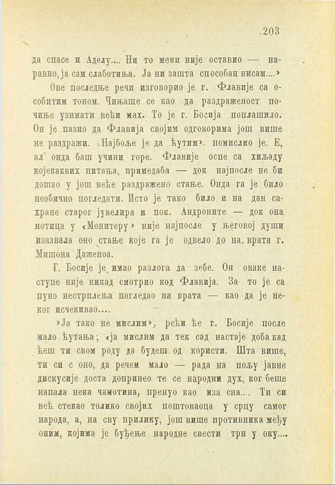 Ове последње речи изговорио је г. Флавије са особитим тоном. Чињаше се као да раздраженост почиње узимати већи мах. То је г. Босија поплашило. Он је пазио да Флавија својим одговорима још више не раздражи. «Најбоље је да ћутим» помислио је. Е, ал’ онда баш учини горе. Флавије оспе са хиљаду којекаквих питања, примедаба — док најпосле не би дошао у још веће раздражено стање. Онда га је било необично погледати. Исто је тако било и на дан сахране старог јувелира и пок. Андроните — док она нотица у «Монитеру» није најпосле у његовој души изазвала оно стање које га је одвело до на врата г. Мишона Даженоа.