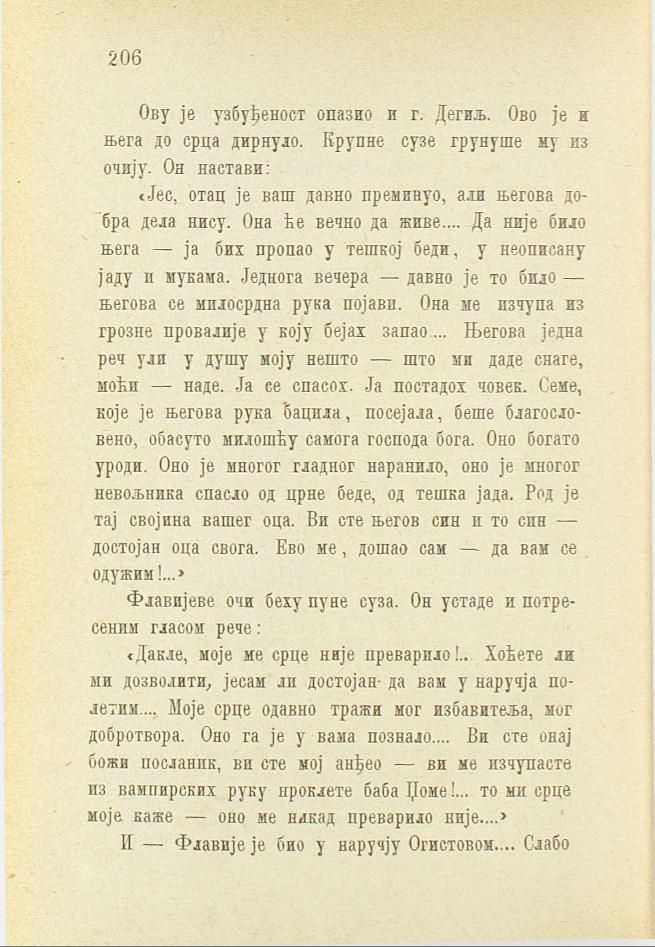 «Јес, отац је ваш давно преминуо, ади његова добра дела нису. Она ће вечно да живе.... Да није било њега — ја бих пропао у тешкој беди, у неописану јаду и мукама. Једнога вечера — давно је то било — његова се милосрдна рука појави. Она ме изчупа из грозне провалије у коју бејах запао.... Његова једна реч ули у душу моју нешто — што ми даде снаге, моћи — наде. Ја се спасох. Ја постадох човек. Семе, које је његова рука бацила, посејала, беше благословено, обасуто милошћу самога господа бога. Оно богато уроди. Оно је многог гладног наранило, оно је многог невољника спасло од црне беде, од тешка јада. Род је тај својина вашег оца. Ви сте његов син и то син — достојан оца свога. Ево ме, дошао сам — да вам се одужим!...»
