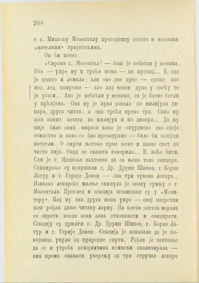 «Сирома г. Мозентал! — баш је небатли у женама. Ето — умре му и трећа жена — на пречац.... Е, ова је нешто и лежала; али оне две прве — одоше као под лед, помреше — као кад човек дуне у свећу те је угаси.... Ако је небатли у женама, он је богме батли у прћијама. Она му је прва донела по милијуна динара, друга читав; а ова трећа преко три. Само му њен накит кошта на милијун и по динара.... Да му није било ових мираза како је спурдисао све своје очинство и како се био презадужио — било би повуци потегли. О смрти његове прве жене и данас свет на чисто није. Онда се свашта говорило.... Е, неће бити. Сам је г. Мишеље захтевво да са њено тело секцира. Секцирање су извршили г. Др. Друин Шиноа, г. Борне Латур и г. Герије Довен — сва три чувена лекара.... Њихово лекарско мњење скинуло је сваку сумњу с г. Мозентала. Преглед и секција штампани су у «Монитеру». Кад му она друга жена умре — онај несретни њен рођак диже читаву ларму. На његов захтев морала се сирота после осам дана откопавати и секцирати. Секцију су држали г. Др. Друин Шиноа, г. Борне Латур и г. Герије Довен. Секција је показала да је покојница умрла од природне смрти. Рођак је захтевао да се и утроба покојничина кемиски анализирала — ама према онаквом уверењу од три стручна лекара