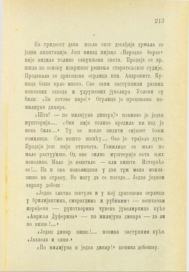 «Шта? — по милијуна динара!» повикао је један муштерија.... «Она није толико вредила ни кад је нова била....» Ту се могло видити сијасет божи гомилица. Све нешто шапћу.... Ово је трајало дуго. Продаја још није отпочета. Гомилице се мало по мало растурише. Од оне силне муштерије оста њих неколико. Мало је коштало — али ништа. Истераће се!... Па и ова неколицина у два три маха изилазише на страну. Не могу да се погоде.... Једва једном - звркну добош: