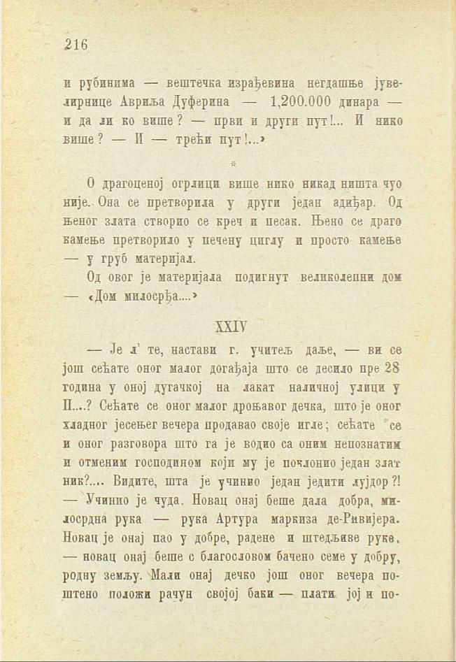 — Учинио је чуда. Новац онај беше дала добра, милосрдна рука — рука Артура маркиза де-Ривијера. Новац је онај пао у добре, радене и штедљиве руке, — новац онај беше с благословом бачено семе у добру, родну земљу. Мали онај дечко још оног вечера поштено положи рачун својој баки — плати јој и последњу