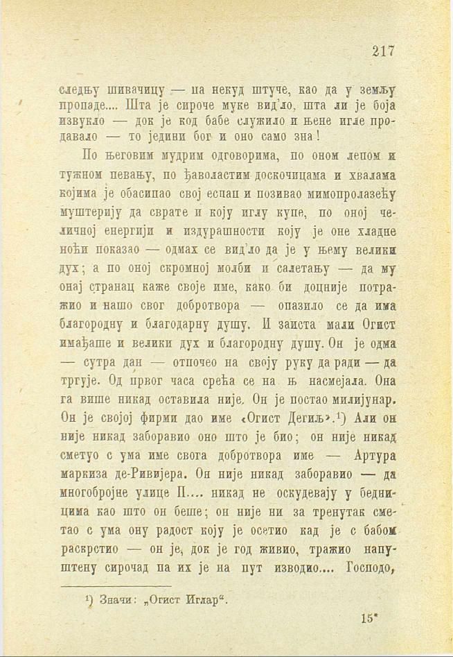 По његовим мудрим одговорима, по оном лепом и тужном певању, по ђаволастим доскочицама и хвалама којима је обасипао свој еспап и позивао мимопролазећу муштерију да сврате и коју иглу купе, по оној челичној енергији и издурашности коју је оне хладне ноћи показао — одмах се вид’ло да је у њему велики дух; а по оној скромној молби и салетању — да му онај странац каже своје име, како би доцније потражио и нашо свог добротвора — опазило се да има благородну и благодарну душу. И заиста мали Огист имађаше и велики дух и благородну душу. Он је одма — сутра дан — отпочео на своју руку да ради — да тргује. Од првог часа срећа се на њ насмејала. Она га више никад оставила није. Он је постао милијунар. Он је својој фирми дао име «Огист Дегиљ».