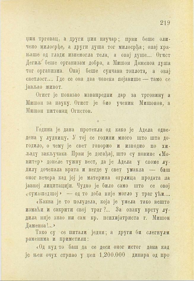 Година је дана протекла од како је Адела одведена у лудницу. У тој се години много што шта догодило, о чему је свет говорио и изводио по хиљаду закључака. Први је догађај, што су новине «Монитер» донеле тужну вест, да је Адела у своме лудилу дочепала врата и негде у свет умакла — баш оног вечера кад јој је материна огрлица продата за јавној лицитацији. Чудно је било само што се овој «сумашедшој» — од то доба није могло у траг ући....