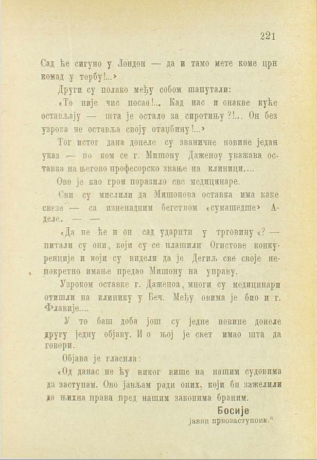 Тог истог дана донеле су званичне новине један указ — по ком се г. Мишону Даженоу уважава оставка на његово професорско звање на клиници....