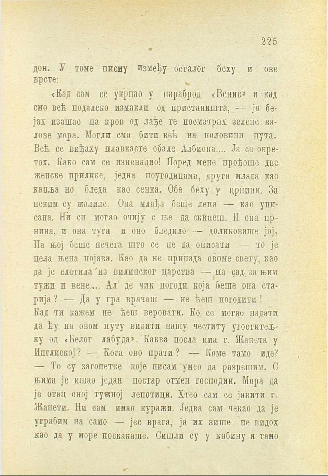 «Кад сам се укрцао у параброд «Венис» и кад смо већ подалеко измакли од пристаништа, — ја бејах изашао на кров од лађе те посматрах зелене валове мора. Могли смо бити већ на половини пута. Већ се виђаху плавкасте обале Албиона.... Ја се окретох. Како сам се изненадио! Поред мене прођоше две женске прилике, једна поугодинама, друга млада као капља но бледа као сенка. Обе беху у црнини. За неким су жалиле. Она млађа беше лепа — као уписана. Ни си могао очију с ње да скинеш. И она црнина, и она туга и оно бледило — доликоваше јој. На њој беше нечега што се не да описати — то је цела њена појава. Као да не припада овоме свету, као да је слетила из вилинског царства — па сад за њим тужи и вене.... Ал’ де чик погоди која беше она старија? — Да у гра врачаш — не ћеш погодити! — Кад ти кажем не ћеш веровати. Ко се могао надати да ћу на овом путу видити нашу честиту угоститељку од «Белог лабуда». Каква посла има г. Жанета у Инглиској? — Кога ово прати? — Коме тамо иде? — То су загонетке које нисам умео да разрешим. С њима је ишао један постар отмен господин. Мора да је отац оној тужној лепотици. Хтео сам се јавити г. Жанети. Ни сам имао куражи. Једва сам чекао да је уграбим на само — јес врага, ја их више не видох као да у море поскакаше. Сишли су у кабину и тамо