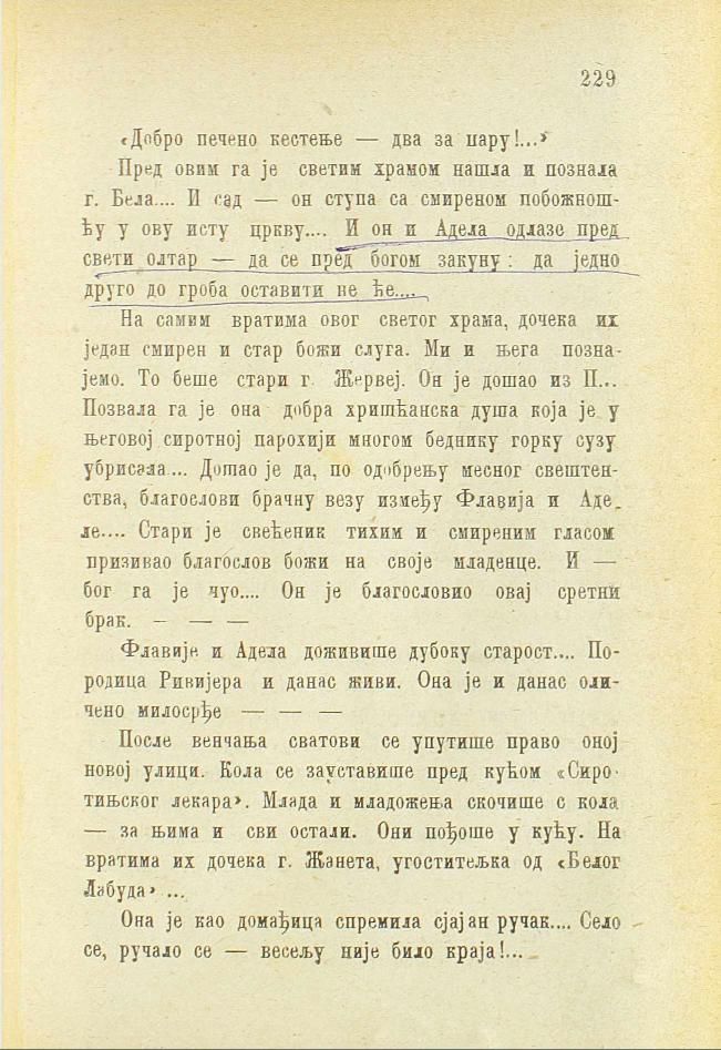На самим вратима овог светог храма, дочека их један смирен и стар божи слуга. Ми и њега познајемо. То беше стари г. Жервеј. Он је дошао из П... Позвала га је она добра хришћанска душа која је у његовој сиротној парохији многом беднику горку сузу убрисала ... Дошао је да, по одобрењу месног свештенства, благослови брачну везу између Флавија и Аделе... Стари је свећеник тихим и смиреним гласом призивао благослов божи на своје младенце. И — бог га је чуо.... Он је благословио овај сретни брак. - — —