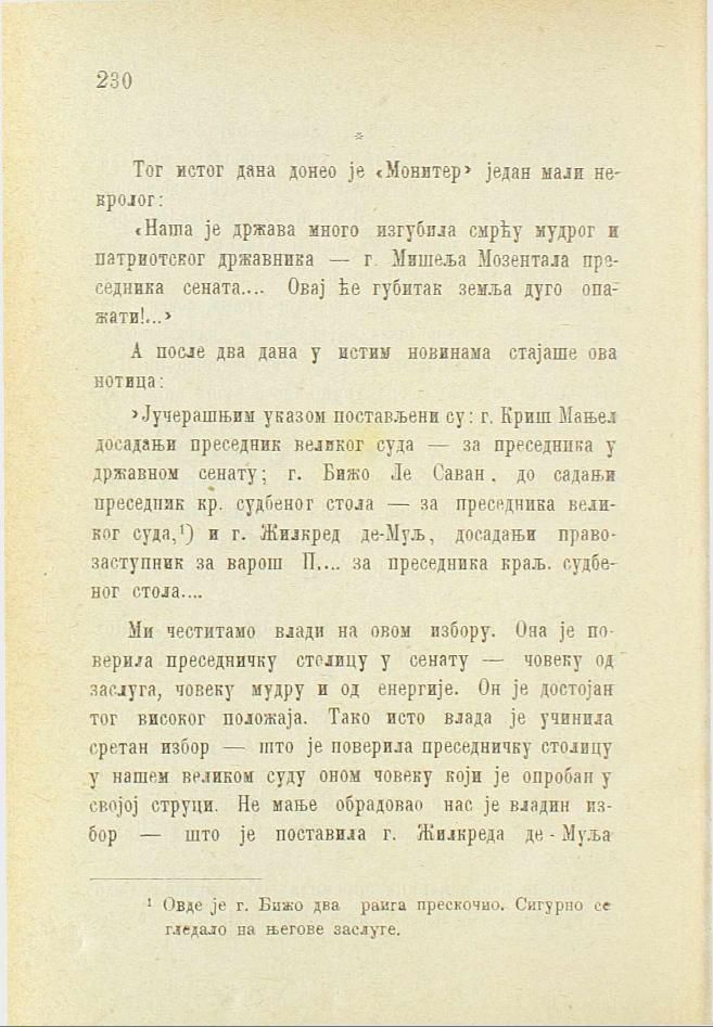 Ми честитамо влади на овом избору. Она је поверила преседничку столицу у сенату — човеку од заслуга, човеку мудру и од енергије. Он је достојан тог високог положаја. Тако исто влада је учинила сретан избор — што је поверила преседничку столицу у нашем великом суду оном човеку који је опробан у својој струци. Не мање обрадовао нас је владин избор — што је поставила г. Жилкреда де-Муља