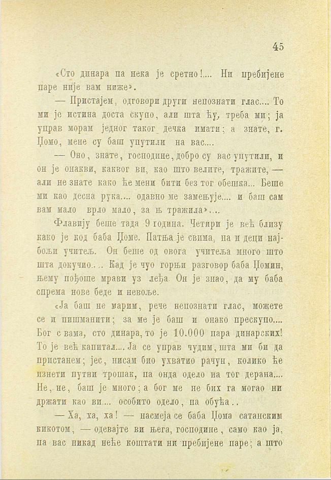 «Ја баш не марим, рече непознати глас, можете се и пишманити; за ме је баш и онако прескупо.... Бог с вама, сто динара, то је 10.000 пара динарских! То је већ капитал.... Ја се управ чудим, шта ми би да пристанем; јес, нисам био ухватио рачун, колико ће изнети путни трошак, па онда одело на тог дерана.... Не, не, баш је много; а бог ме не бих га могао ни држати као ви.... особито одело, на обућа..