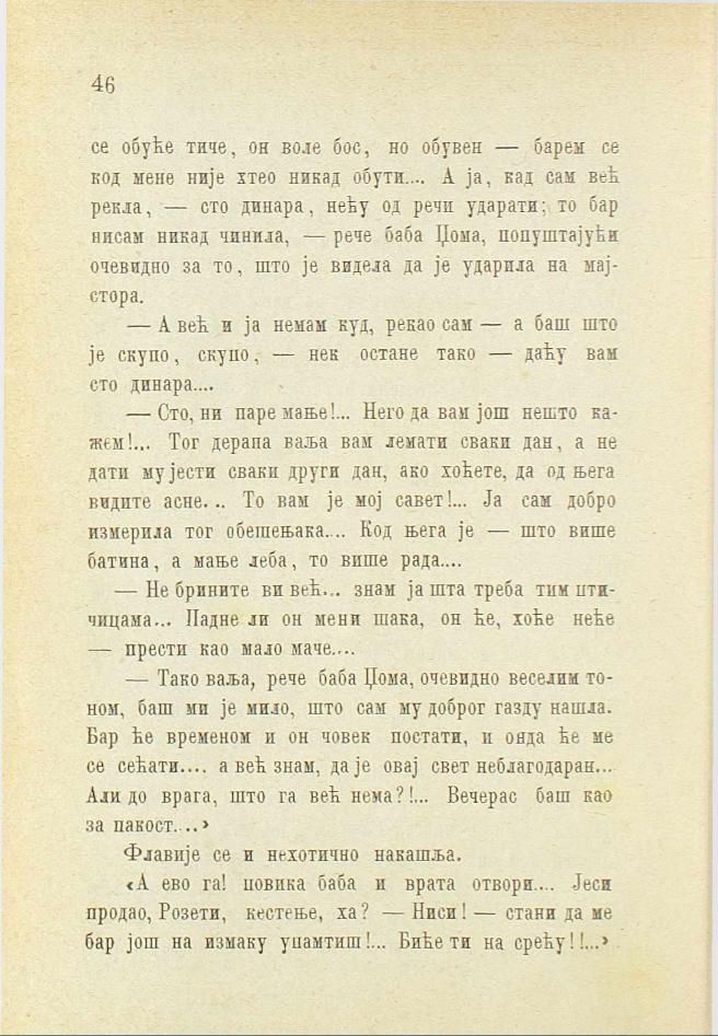 — Тако ваља, рече баба Џома, очевидно веселим тоном, баш ми је мило, што сам му доброг газду нашла. Бар ће временом и он човек постати, и онда ће ме се сећати.... а већ знам, да је овај свет неблагодаран... Али до врага, што га већ нема?!... Вечерас баш као за пакост....»