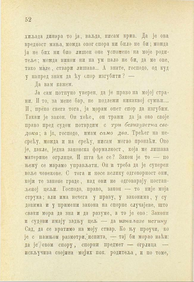Ја сан потпуно уверен, да је право на мојој страни. И то, за мене бар, не подлежи никаквој сумњи.... И, преко свега тога, ја морам опет спор да изгубим. Такви је закон. Он хоће, он тражи да ја ово своје право пред судом потврдим с три бсзизузетна сведока; а ја, господо, имам само два. Трећег на несрећу, можда и на срећу, нисам могао пронаћи. Ово је, дакле, једна законска формалност, која ме лишава материне огрлице. И шта ће се? Закон је то — по њену се марамо управљати. Он и треба да је суверен воље човекове. С тога и носе велику одговорност они, који те законе граде, кад ови не одговарају постављеној цељи. Господо, право, закон — то није моја струка; али има нечега у праву, у законима, у судовима и у примени закона на спорне случајеве, што сваки мора да зна и да разуме, а то је ово: Закони и судови имају задњу цељ — да изналазе истину. Сад, да се вратимо на моју ствар. Ко њу проучи, ко је с пажњом размотри,испита, — тај би морао наћи: да је у овом спору, спорни предмет — огрлица — искључива својина мојих пок. родитеља, и по томе,