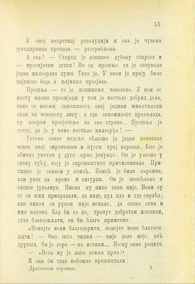 Готово сваке недеље облазио је један непознат човек овај сиромашни и пусти крај вароши. Био је обично умотан у дуго црно јапунџе. Он је улазио у сваку кућу, коју је сиромаштина притискивала. Притицао је сваком у помоћ. Помоћ је била скромна, али увек на време и сигурна. Он је посећавао и слепог јувелира. Имена му нико знао није. Неки су се за њим прикрадали, да виде, куд иде и где свраћа; али ником за руком није испало, да сазна стан и име његово. Кад би тако, тронут добротом његовом, стао благосиљати, он би благо приметио: