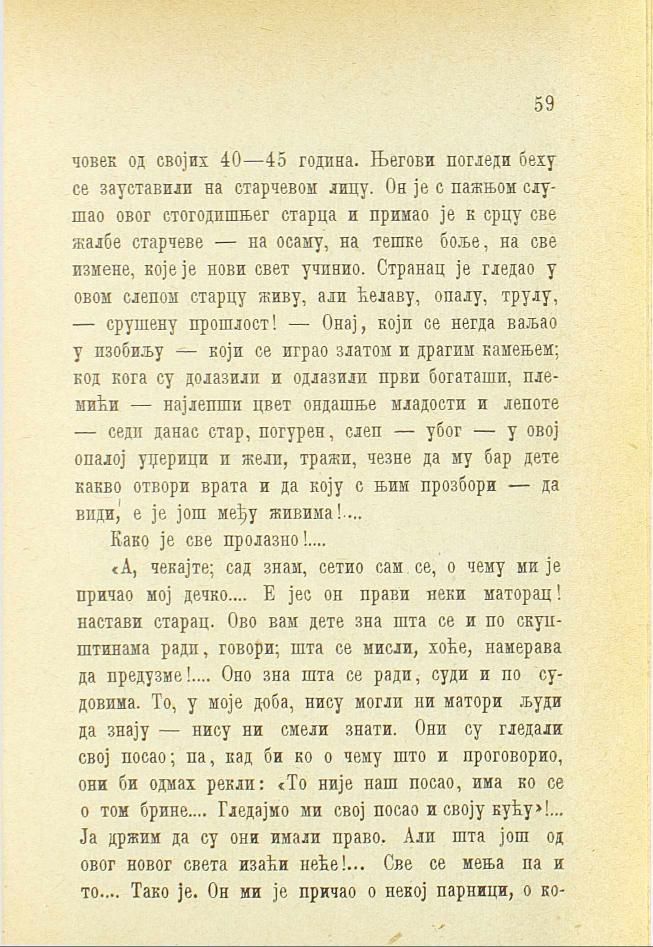 «А, чекајте; сад знам, сетио сам се, о чему ми је причао мој дечко.... Е јес он прави неки маторац! настави старац. Ово вам дете зна шта се и по скупштинама ради, говори; шта се мисли, хоће, намерава да предузме!.... Оно зна шта се ради, суди и по судовима. То, у моје доба, нису могли ни матори људи да знају — нису ни смели знати. Они су гледали свој посао; па, кад би ко о чему што и проговорио, они би одмах рекли: «То није наш посао, има ко се о том брине.... Гледајмо ми свој посао и своју кућу»!... Ја држим да су они имали право. Али шта још од овог новог света изаћи неће!... Све се мења па и то.... Тако је. Он ми је причао о некој парници, о којој