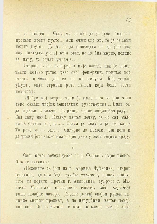 «Позовите се још на г. Авриља Дуферина, старог јувелира, да вам буде трећи сведок у вашем спору, што га водите против г. Андроните супруге г. Мишеља Мозентала преседника сената, због огрлице ваше покојне матере. Сведок је тај својом руком начинио спорни предмет, а по наруџбини вашег покојног оца. Он је истина и стар и слеп; али је опет