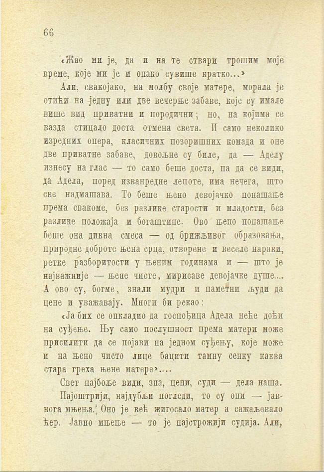 Али, свакојако, на молбу своје матере, морала је отићи на једну иди две вечерње забаве, које су имале више вид приватни и породични; но, на којима се вазда стицало доста отмена света. И само неколико изредних опера, класичних позоришних комада и оне две приватне забаве, довољне су биле, да — Аделу изнесу на глас — то само беше доста, па да се види, да Адела, поред изванредне лепоте, има нечега, што све надмашава. То беше њено девојачко понашање према свакоме, без разлике старости и младости, без разлике положаја и богаштине. Ово њено понашање беше она дивна смеса — од брижљивог образовања, природне доброте њена срца, отворене и веселе нарави, ретке разборитости у њеним годинама и — што је најважније — њене чисте, мирисаве девојачке душе.... А ово су, богме, знали мудри и паметни људи да цене и уважавају. Многи би рекао: